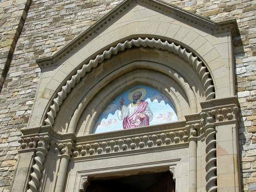 architrave above the front door is an interesting relic of the ancient church. The structure of the church is imposing and its bell-tower