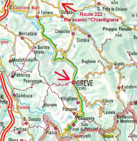 The road winds down towards the valley of the river Greve as far as Greve in Chianti. The town centre is constituted by piazza Matteotti, the ancient market place with irregular plan ancl porticoes which sustain several terraces. At the entrance of the town, going towardss Florence and following a , winding road you arrive at Montefioralle, a village with a medieval castle and the church of S. Stefano, which exhibits several works of art and in particular a panel painting by the so-called Master of Greve.